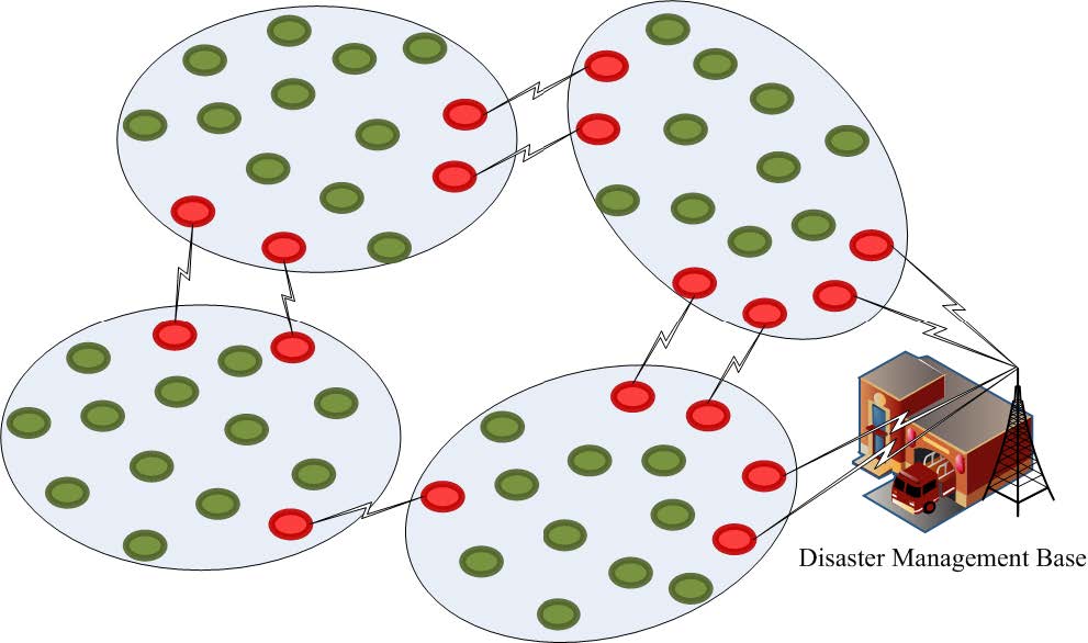 - Clusters of nodes share spectrum information, while gateway nodes connect clusters and relay aggregated traffic toward crisis centers.