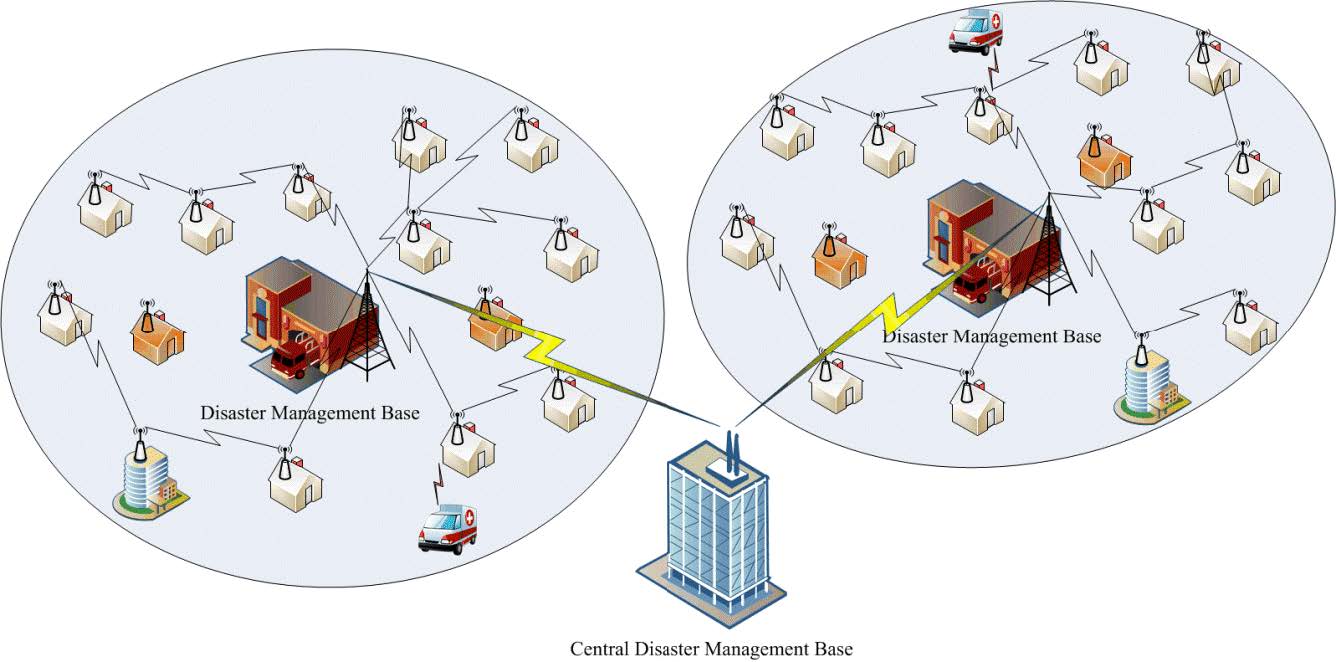 - Each node is deployed in buildings and participates in a multi-hop, cooperative ad-hoc network that forwards data to hardened crisis-management stations.